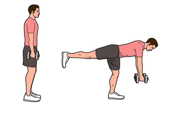 方法:雙腳分開站立,雙手握住啞鈴。首先彎曲臀部開始,在身後將一條腿後伸以保持平衡。繼續放低啞鈴,直到與地面平行,然後返回直立位置。