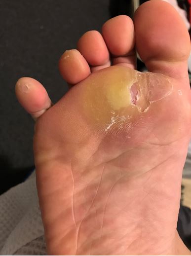 原來丸龜半馬後幾公里,那腳底水泡的感覺是真的,而且還是已成了血泡,關鍵原因就在於右腳襪子在腳掌處已磨破了,這雙明明才穿不到5次還是近乎全新的襪子,就這麼提早夭折了。而血泡就在破洞處產生,還是個不算淺的血泡,只得硬上刺破它,期盼一週後能快速康復。