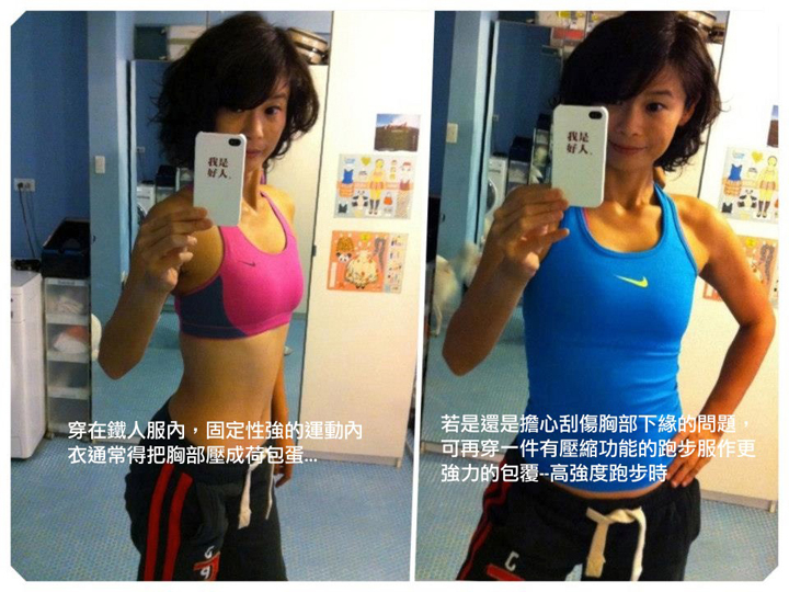回到可以把 D 罩杯壓成荷包蛋一樣的專業跑步內衣的話題,我個人建議在這樣的運動內衣外最好再穿上一件可以加強固定的專業將身體包緊緊的跑步服(照片右邊的那件就是),兩層一定可以把胸部級運動內衣都固定得夠牢,應該就不會磨破下沿了,跑步時也不會有晃動的問題。另我也推薦穿緊身的鐵人服,一整個全身都可以繃緊緊的,在激烈的比賽及長距離跑步時對於胸部的固定性更好。