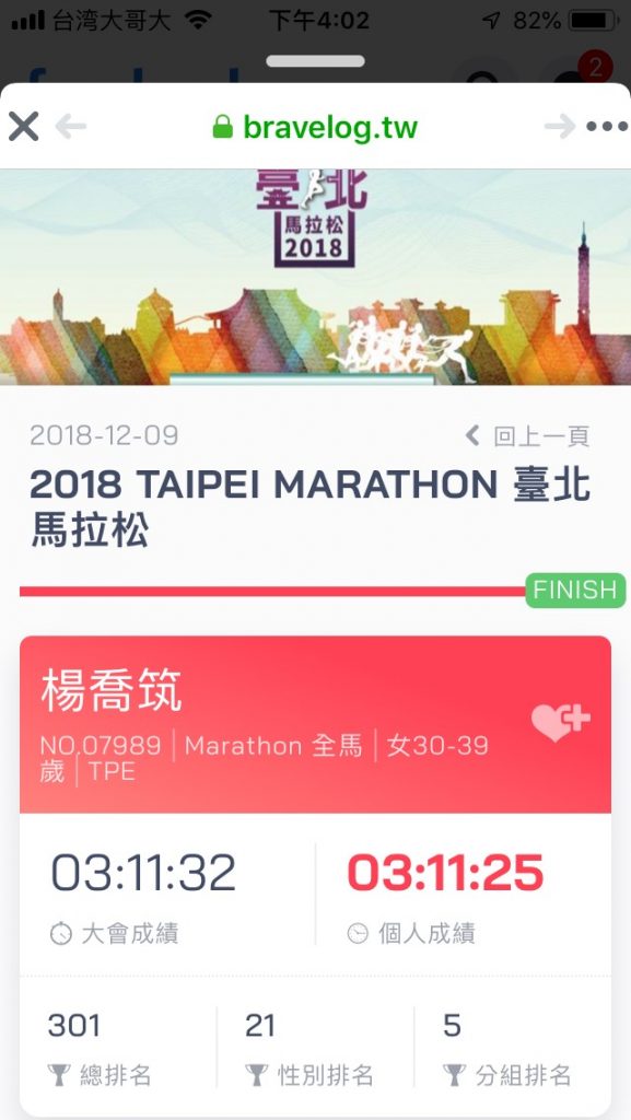 在 Fast42 長達十六周的訓練後,喬筑在2018年臺北馬拉松跑出3小時11分的個人最佳成績。完賽後非常地感動且高興。在近七千人的賽事中排名302名。一塊跑出佳績的夥伴與團隊,也一塊構成了對臺北馬拉松的特殊存在感。不再只是一場馬拉松賽事,而是深植心底的榮耀與共鳴。