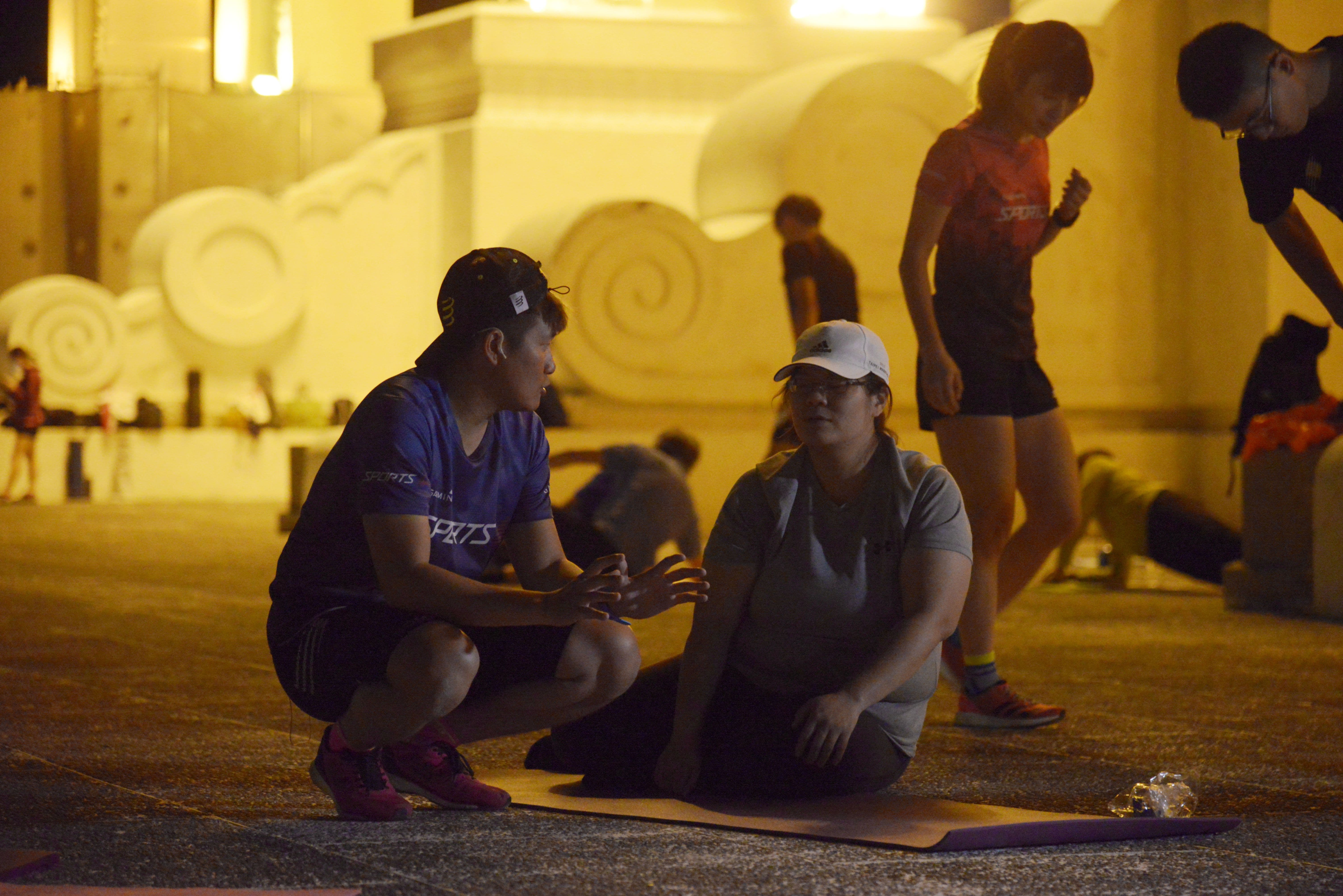 戴著麥克風,蔡孟儒在圍成一圈的學員中細心解說分解動作。他是儒意運動創辦人,開跑前帶著學員在瑜珈墊上進行肌力訓練,不只提點常見的錯誤,還會一直給予鼓勵,甚至幽默一下,即使學員因訓練有些疲憊,但都是帶著笑容完成。