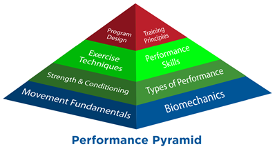 NSCA 所提競技訓練金字塔,包括基礎動作培養、運動生物力學動作分析、運動表現分類、肌力與體能訓練、專項動作技巧、專項動作技術,最後以致訓練原則和課表設計。