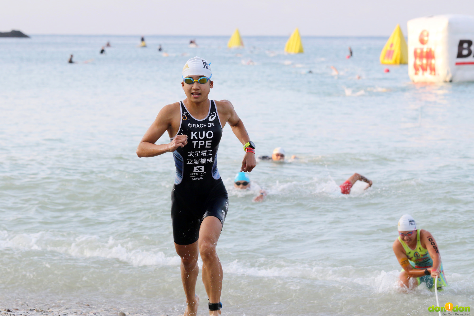菁英女子組部分,前三名分別由張嘉家、郭家齊以及陳玉玲拿下。游泳項目郭家齊領先上岸,但是張嘉家緊跟在後,兩人游泳成績差距在伯仲之間,分別為 00:28:09、00:28:15,差距不到 10 秒,競爭相當激烈!90 公里自行車,張嘉家一路保持著與郭家齊視線以內的差距,兩人一前一後回到 T2 轉換區,決戰路跑。