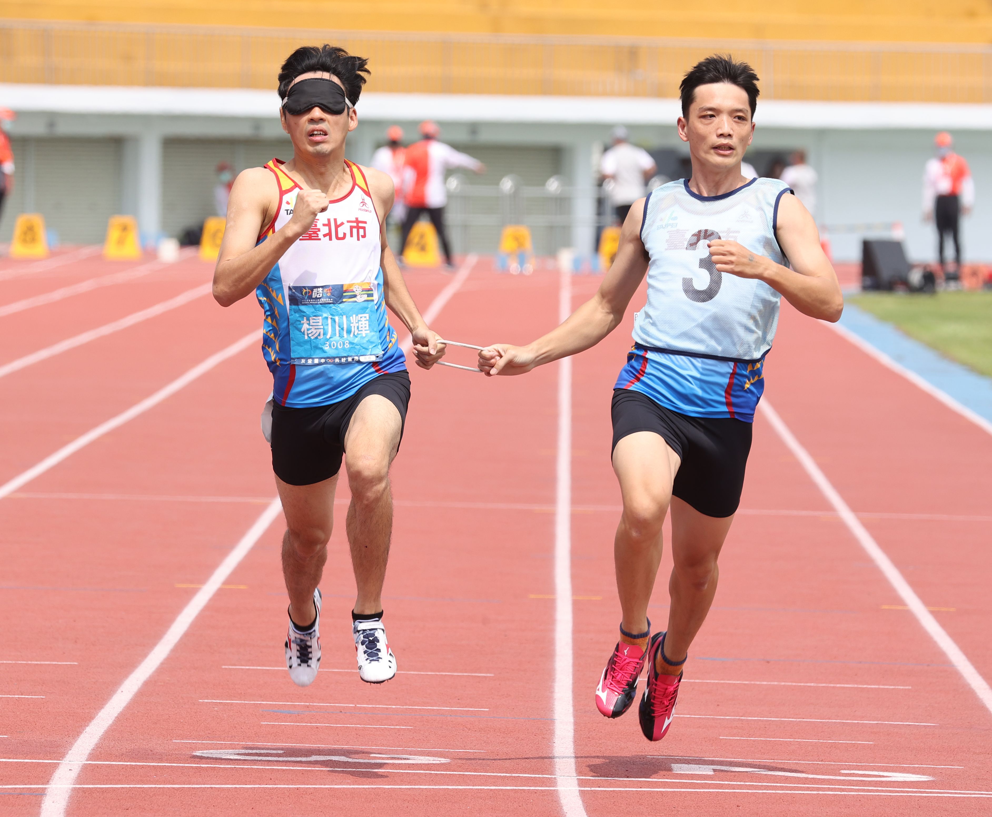 代表臺北市參加田徑項目的視障選手楊川輝,個人包辦男子 100公尺、 200 公尺、 1500 公尺、跳遠及三級跳遠共五面金牌,其中在三級跳遠項目,更以 9 公尺 69 成績改寫自己所保持的全國紀錄,其實力值得肯定。但對視障選手而言,最大的問題在於「看不見」。若是「陪跑員」沒有相當的實力,也無法幫助楊川輝締造此一驚人成績。