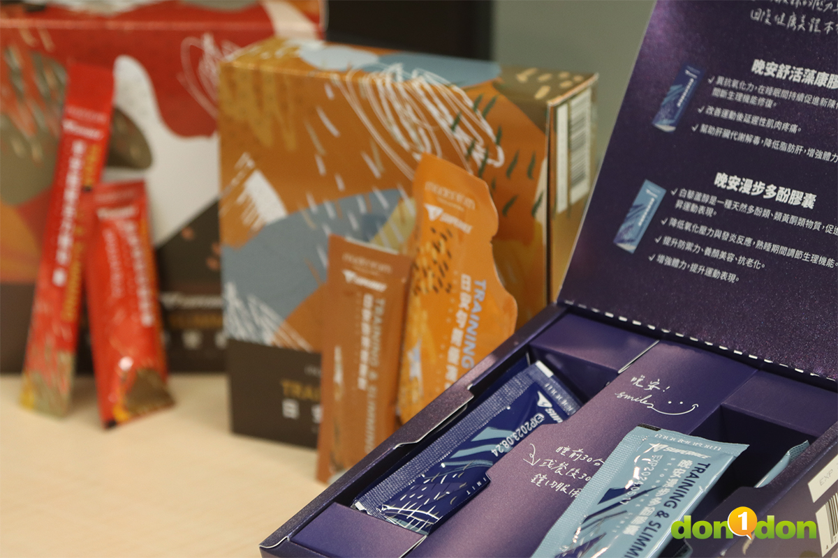 輕賦活力輔助使用了調節免疫功能、抗氧化與抗發炎的褐藻菜萃取物、烏梅蜜及礦物質濃縮液;運動過後,使用結合紅花籽油、藤黃果萃取物、褐藻粉末及草本萃取物組成的優燃促纖膠囊,在膠囊中最受公認的是健康油脂共軛亞油酸,不同於一般市面上的氫化油脂或炸物用油,共軛亞油酸是人體必需脂肪酸,幫助提升脂肪代謝。