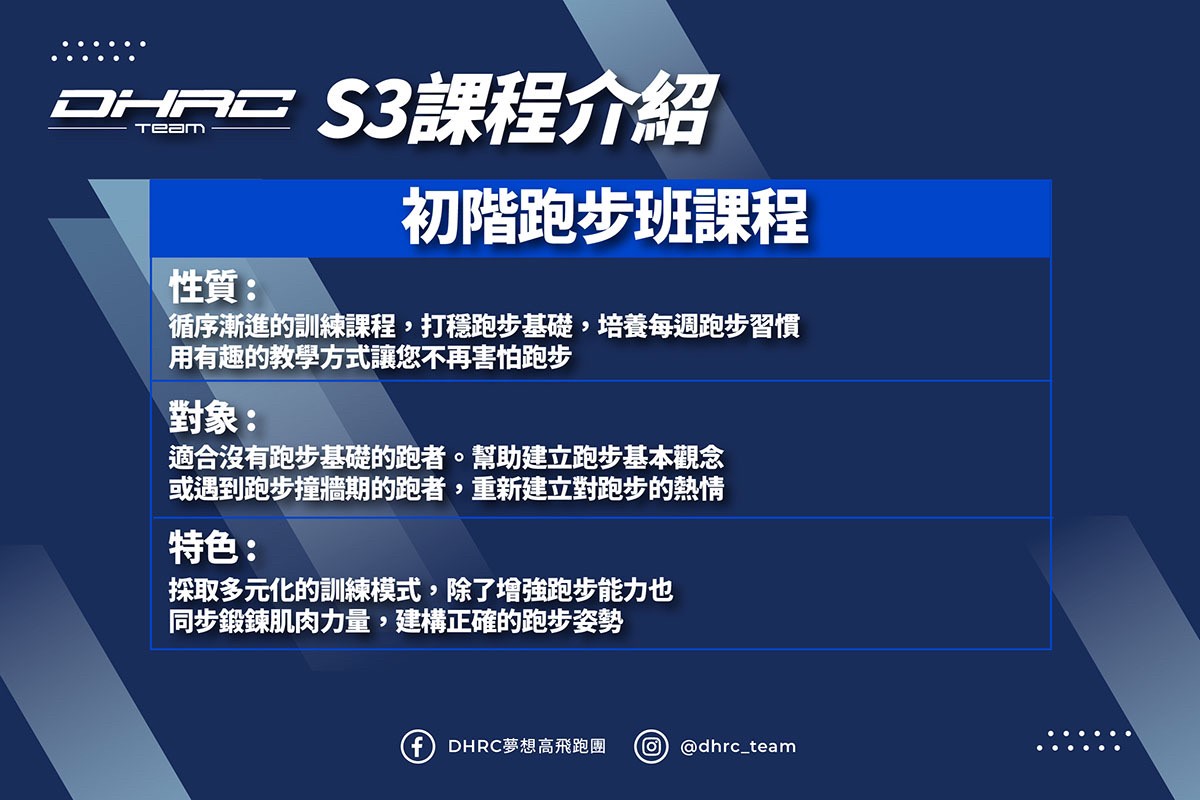 2022 年正式邁入第 3 季跑步課程的 DHRC ,推出十位教練及助教執教初階跑步班、臺北馬抱佛腳班、臺北馬突破班以及跑者肌力班,十四堂課程加上四堂週末團體訓練,歡迎無論是初學者或進階跑者,都能從夢想高飛跑步社團收穫健康、體能與正確的跑步觀念。