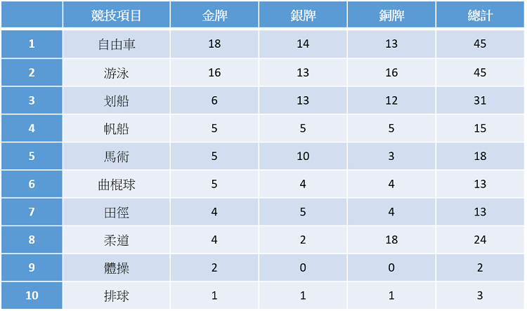 1956-2022 荷蘭夏季奧運奪牌前 10 名項目