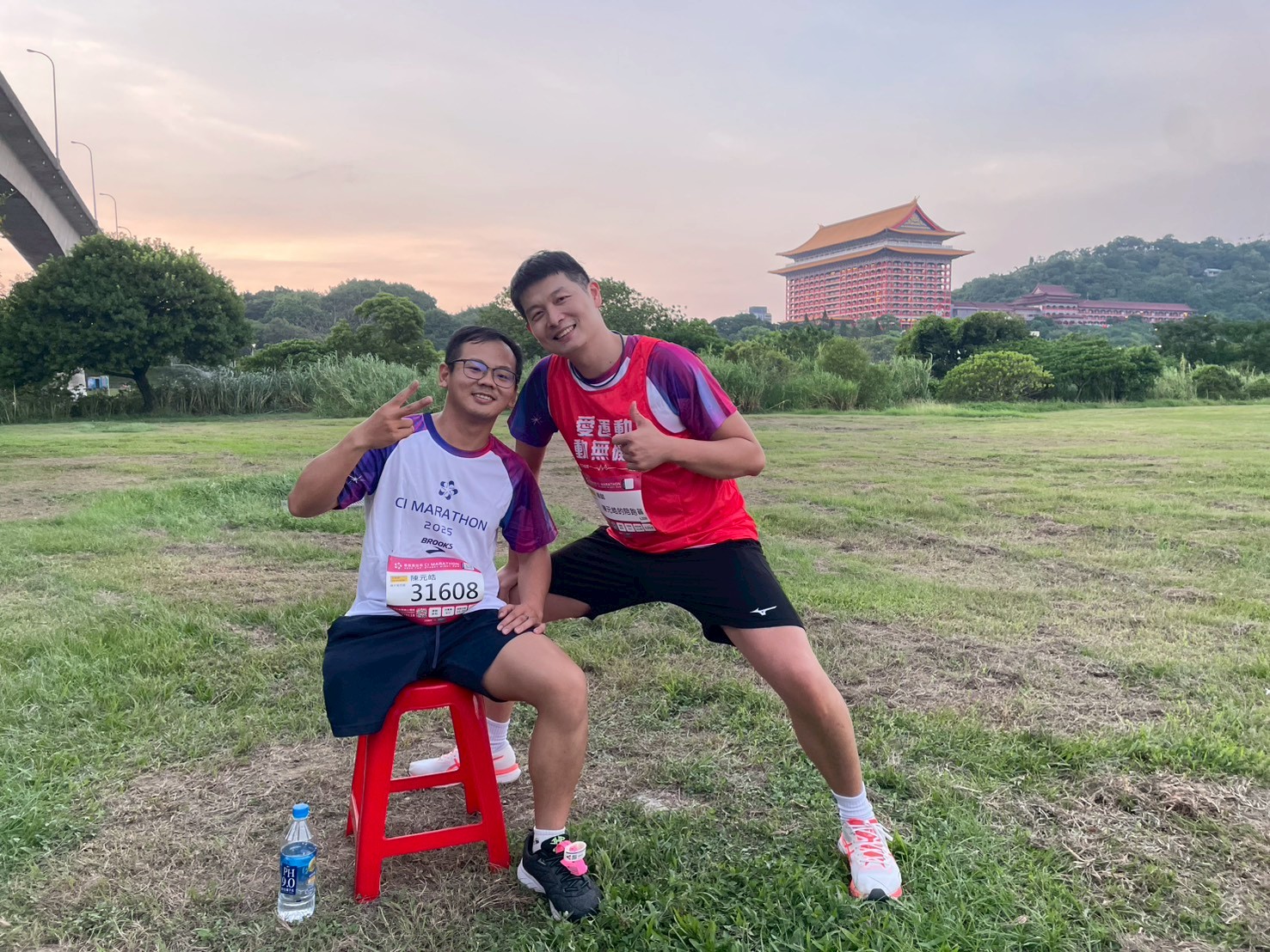 儘管如此,他依然感謝多次比賽的黃金搭檔葉翰霖老師,兩人一路上有說有笑,才能順利完賽。而翰霖老師也大方分享比賽中的有趣觀察:有對兄妹檔對賽道上的輪椅跑者充滿好奇,說著「有輪子用手推著跑,感覺真棒!」的童言童語令人莞爾。