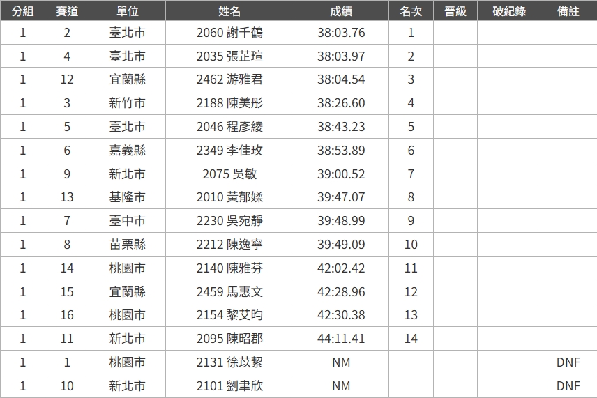 首次站上全運會舞台挑戰 5000 與 10000 公尺場內賽的臺北市程彥綾,此次表現可圈可點,過去專攻全程馬拉松,今年也踏上場內賽感受賽場上的激戰氛圍,最終以 38:43.23 拿下第五。