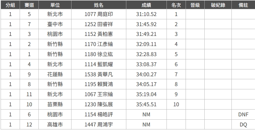 取得第四佳績的彥綸(32:09.11)則表示,在第一圈時想加速,但發現跑不太起來,所以採取保守策略,跟在集團底下穩穩地跑;在全運會前,幾乎都是在準備八月份完成的那場全馬,但由於全馬及場內賽課表有落差,他自覺場內賽的週期不夠完整,所以今天的成績對他來說已經算是及格。