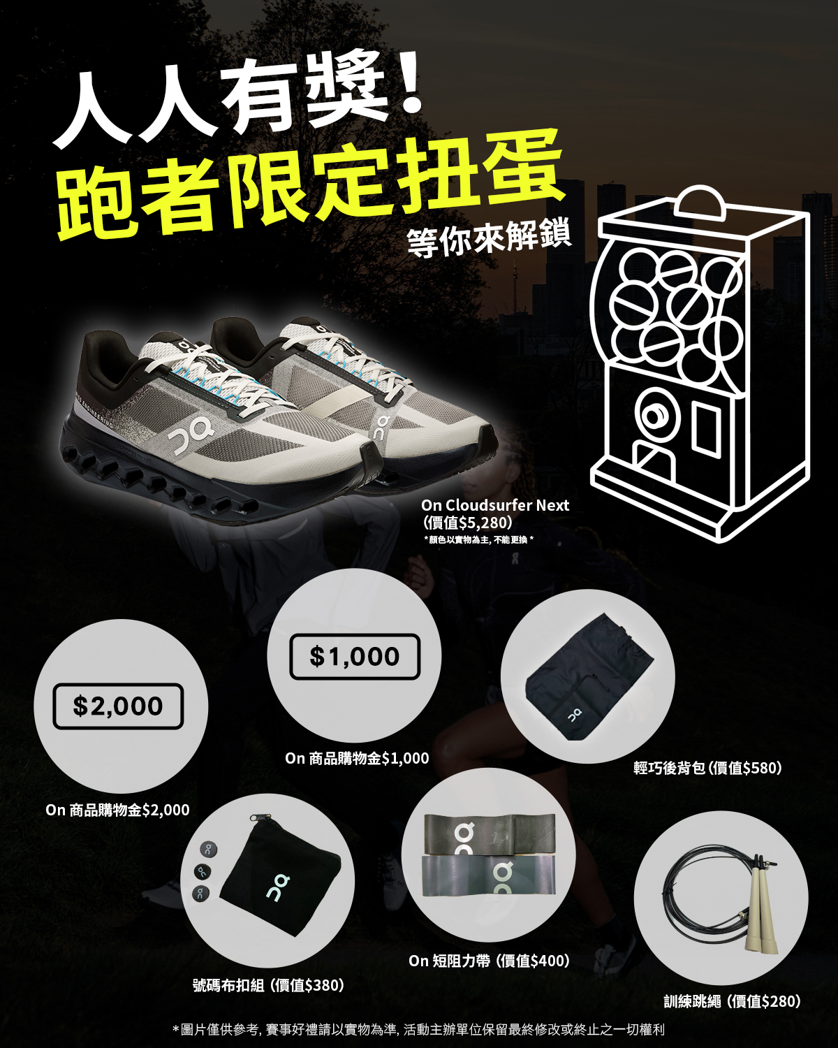 為激發參賽跑者與團隊跑出最佳成績,團體賽獎額達最高新台幣 $35,000 商品購物金,另包含多款 Cloudflow 5、Cloudsurfer Next 等 On 經典跑鞋及服飾配件。不僅能在賽道上盡情體驗疾速快感,更有機會將專屬榮耀與更多好禮一同帶回家。