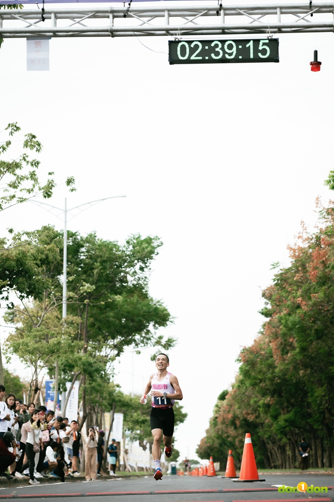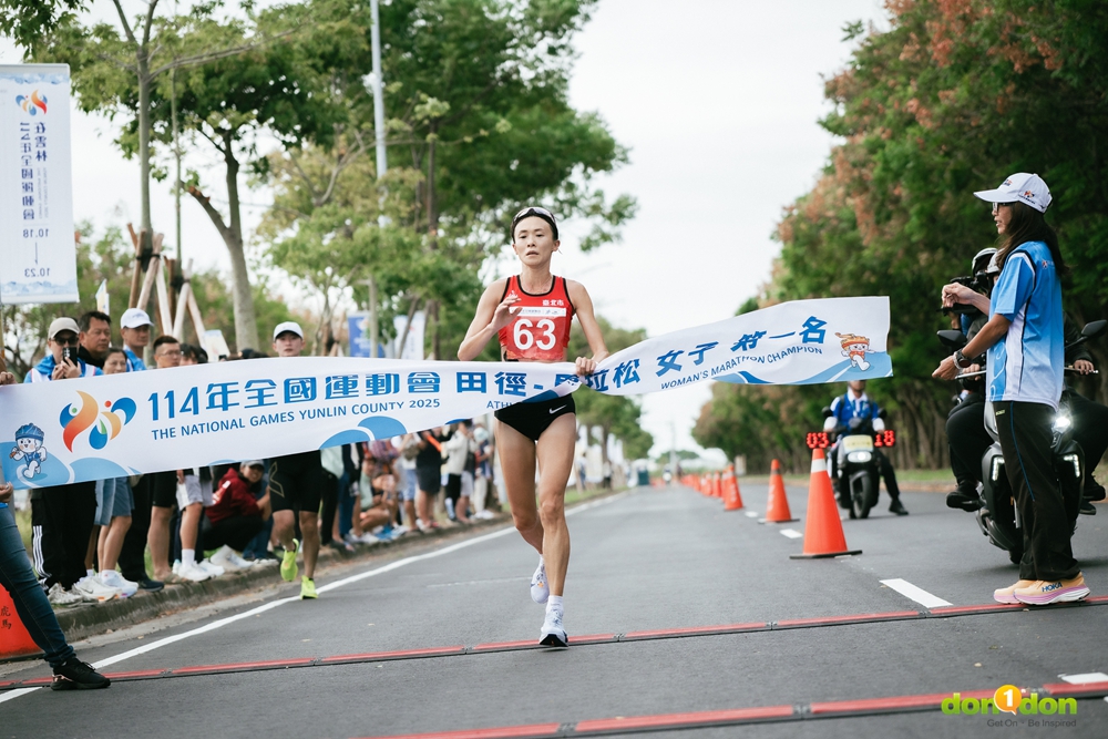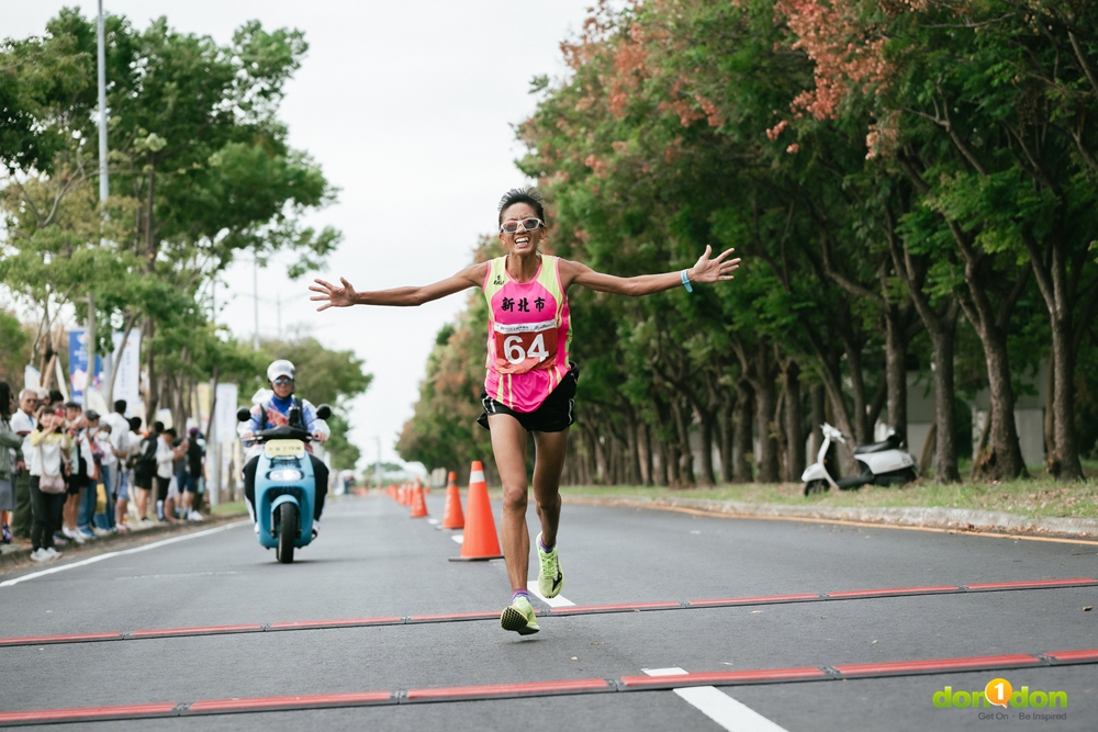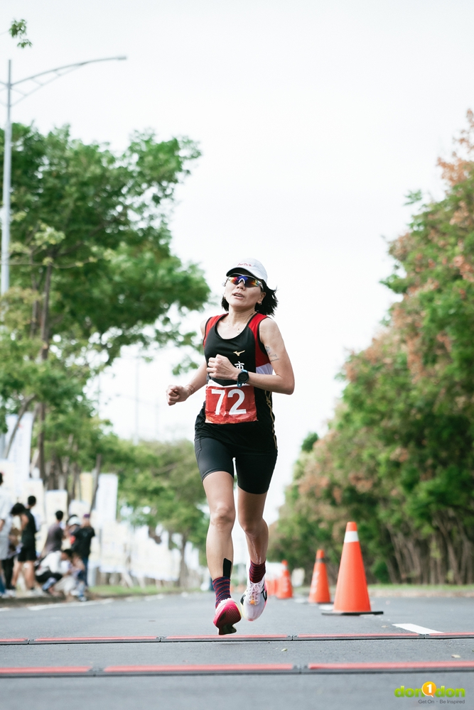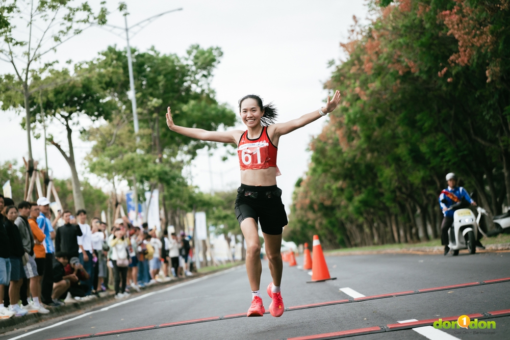 「後半段真的跑得很掙扎。」新竹市代表選手楊馥菁笑說,儘管風勢強勁,節奏難以掌控,但楊馥菁仍以 3:14:10 完成比賽。