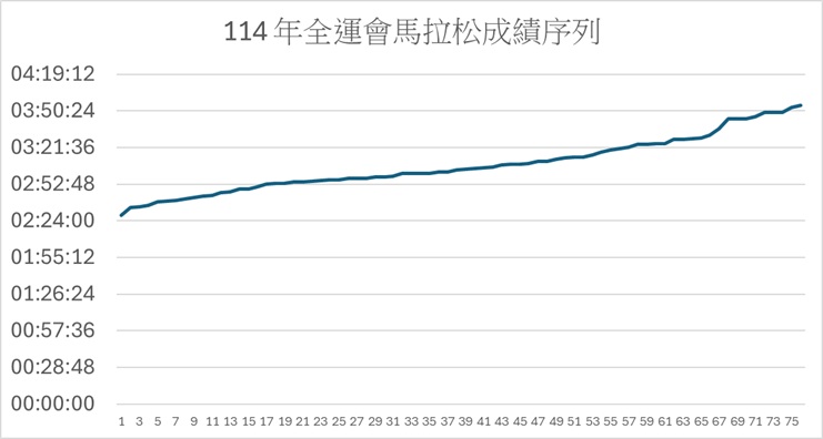 在 110 年新北全運會,女子參賽選手多半是田徑競技選手背景,而到 114 年則是田徑選手/市民跑者各半。男子選手部分,田徑選手/市民跑者都普遍落於六四分左右;為此我曾經想過,男女選手的成績要差異多少才是『合理』的,以 114 年與 110 年為例,男女平均相差時間為 28 分鐘、13 分鐘,而台南全運會則為 21 分鐘。