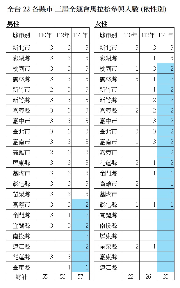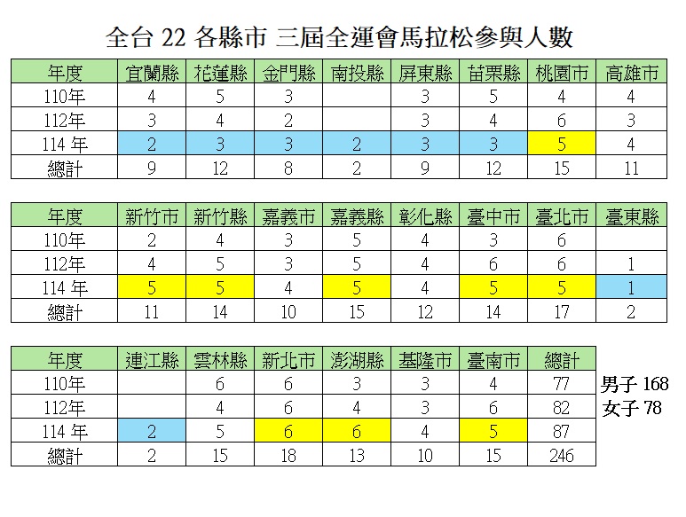 藍底的部分,意味著該縣市選派選手低於 4 人的縣市,包含宜蘭、花蓮、金門、南投、屏東與苗栗、臺東、連江縣等,其中南投縣與連江縣更是連續兩屆全運會沒有選手出賽,而在 114 年才派出二員,南投縣為鍾瑋杰、潘明宏,連江縣為陳永錚、曹鼎。臺東縣則是連續兩屆都由顧紘慈 (小顧) 上場參賽,獲得 2:39:48 第六名成績。期待後續各縣市的體育單位,能有充足的資源幫助選手上場競賽。