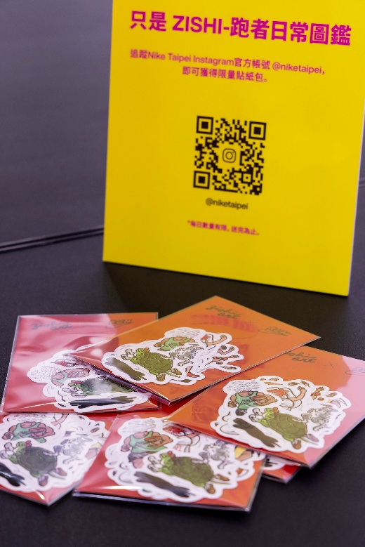 觀展者於現場追蹤Nike Taipei Instagram 官方帳號即可獲得「只是 ZISHI-跑者日常圖鑑(貼紙包)」,陪伴跑者面對每次練跑前的小劇場!