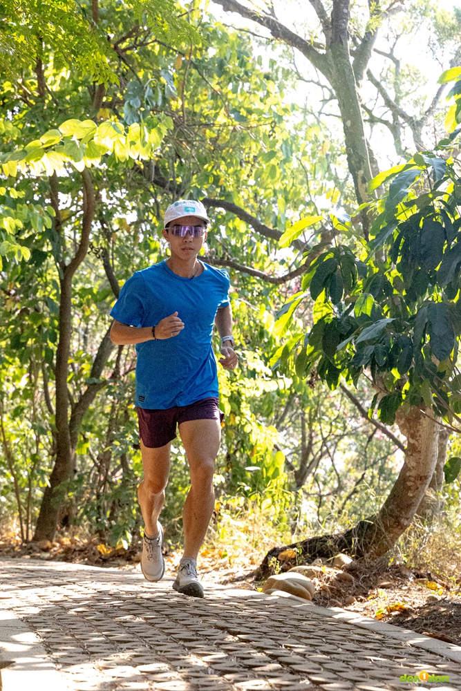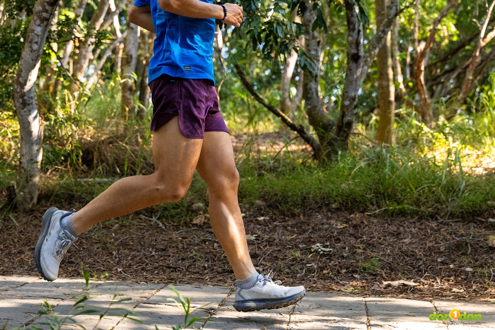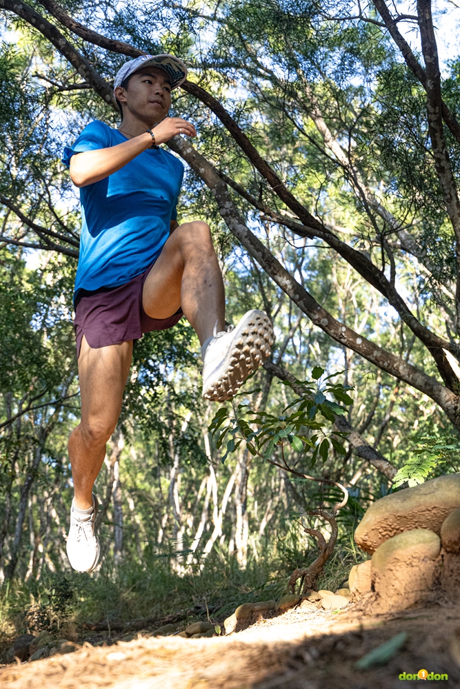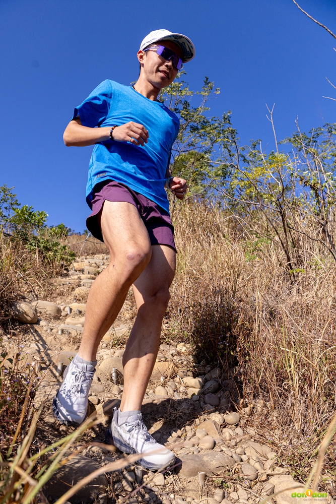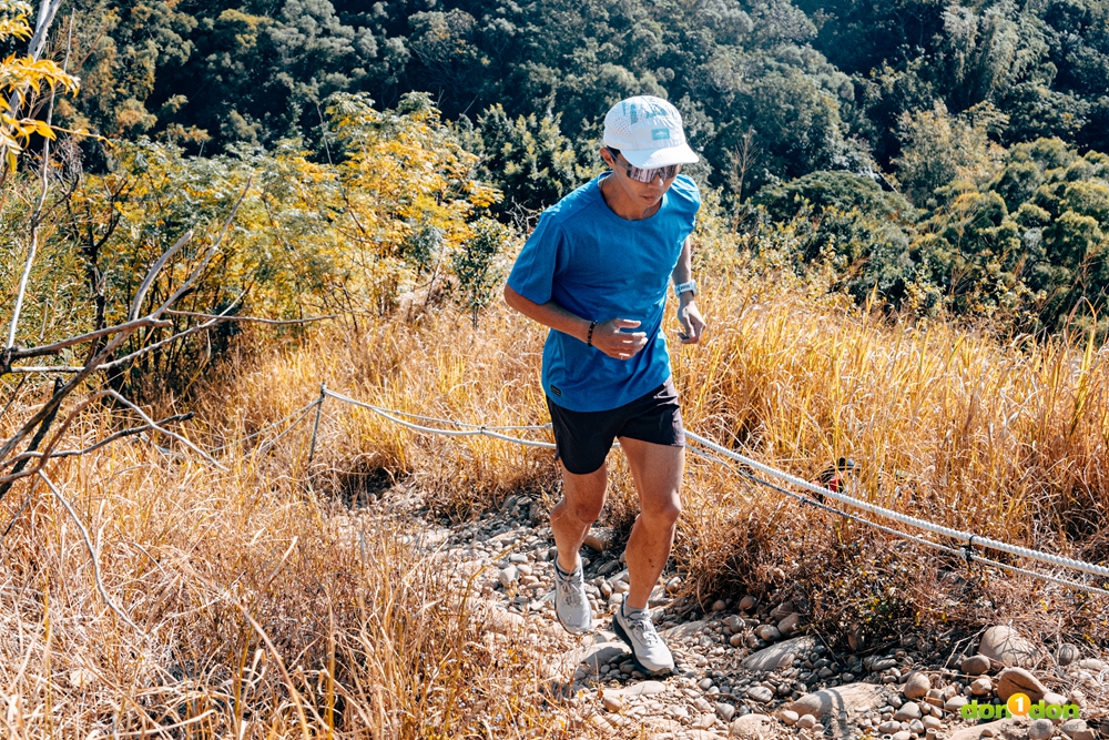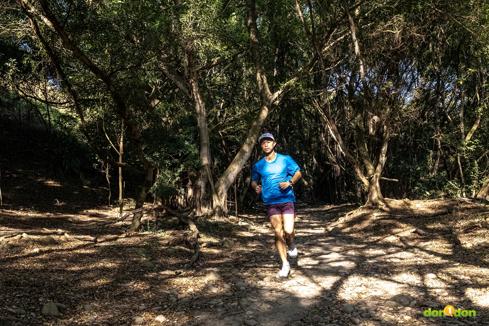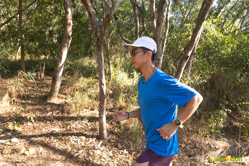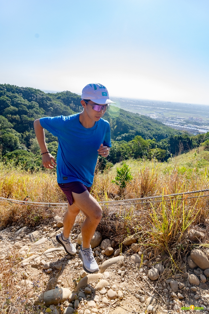隨著山徑的坡度漸陡,宇穆在石梯與柏油路的步伐也越加快速,他提及鞋頭擁有岩石防護板加強技術型越野路線的防護設計十分加分,不僅讓他無需擔心石頭、樹根的撞擊,提升整體安全性,也可以有效延長跑鞋的使用壽命;即使遇到雨天訓練或需要越過水窪也不用擔心,高強度透氣網布鞋面可以快速排出水氣,保持雙腳的舒適度。