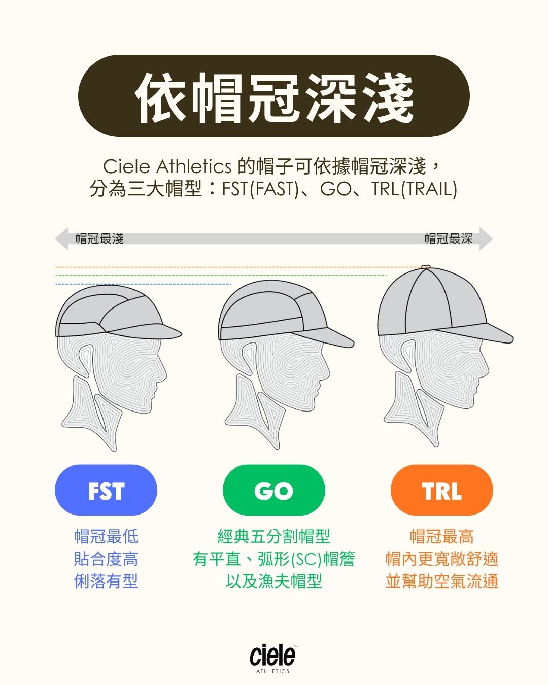 FST 系列帽冠最低,貼合度高,適合追求速度與俐落感的跑者;GO 系列為經典五片式帽型,平衡性能與日常穿搭;TRL 系列則採用最高帽冠設計,提供更寬敞的內部空間與優異的空氣流通性,特別適合越野與長時間運動。除此之外,也延伸出 FSTVisor 遮陽帽款、以及 GOBucket 漁夫帽等帽型,滿足不同跑步風格與環境需求。