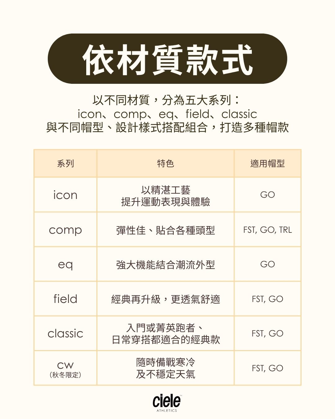 Ciele 帽款依照布料與使用情境,劃分為 icon、comp、eq、field、classic,以及秋冬限定的 cw 系列。
