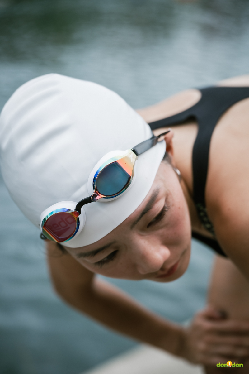 由 100% 矽膠製成的 Speedo 泳帽 Plain Moulded,現場看 Meimei 示範,非常輕巧地就能將長髮收束於內,並簡單地穿戴貼合頭部。「不會扯到頭髮,很貼合頭部,水阻也相對會小一點。」她邊示意,邊補充,「而且彈性真的很好,這樣耗損率也會小些。防水性也不錯,冬天泳訓時也比較不擔心進水後會變冷的問題。」這些細節對 Meimei 來說都很重要。