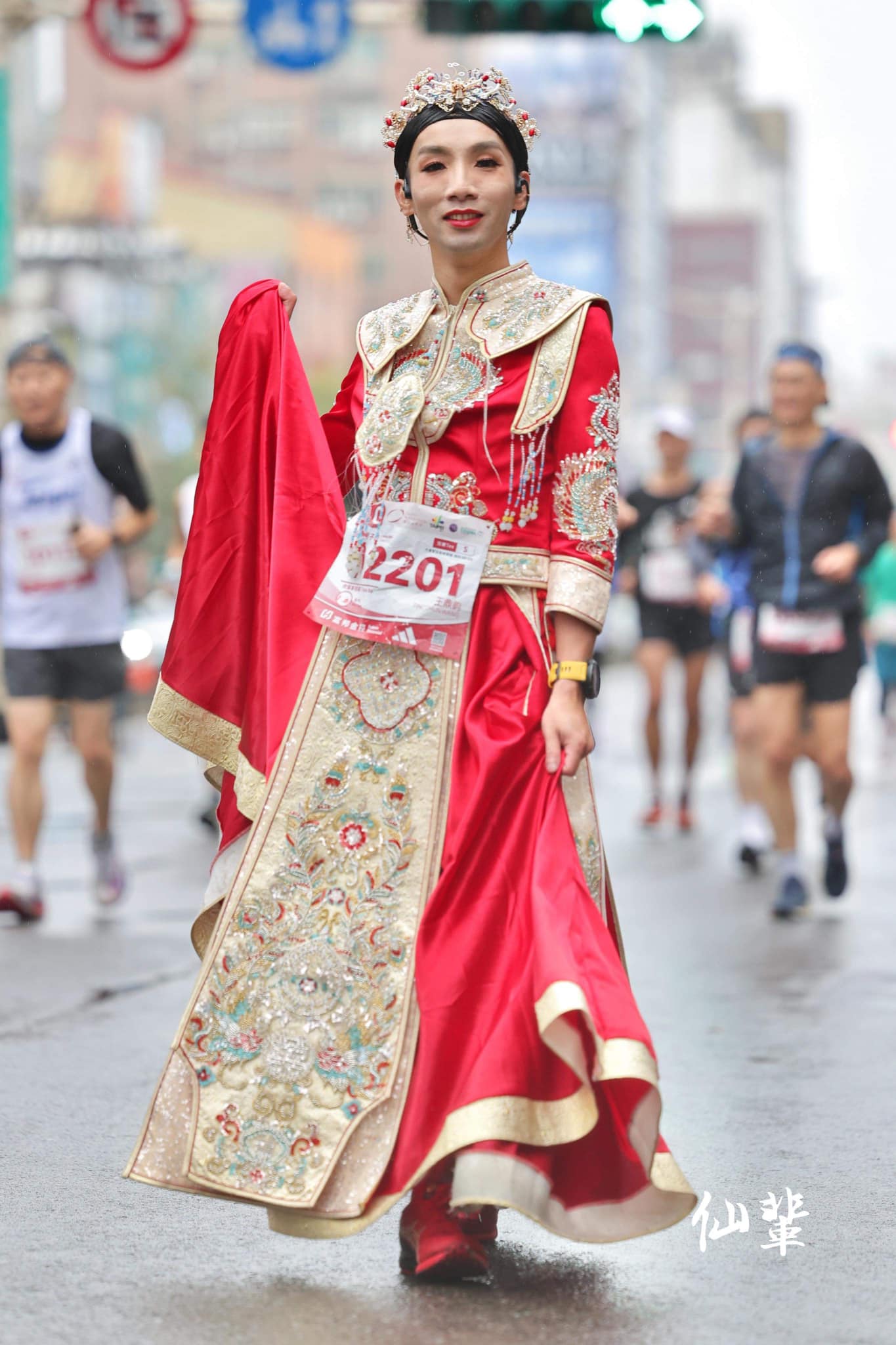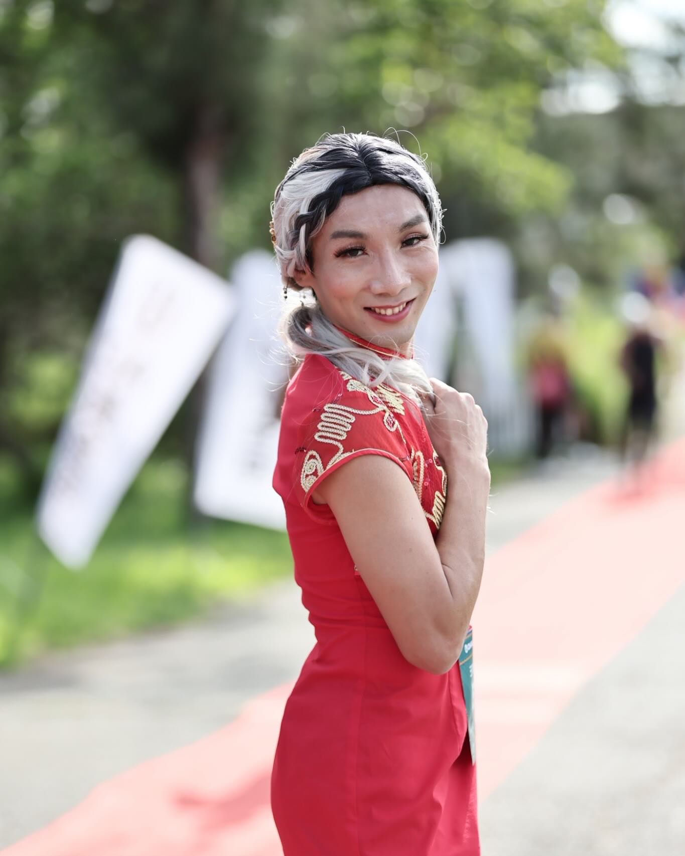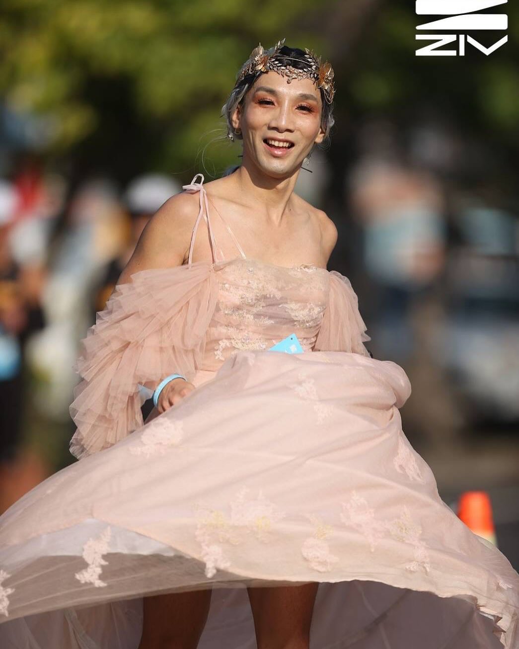 清晨的起跑點,天色才濛濛地亮起來,城市正準備甦醒。起跑線上,跑者熱身、開錶或是與身旁跑友閒話家常。但是,在人群之中,總有一個讓人忍不住多看一眼的身影——完整的妝容與高雅的服飾,衣裝在微光中晃動,他不是來走紅毯,而是整場比賽,都是他的伸展台。