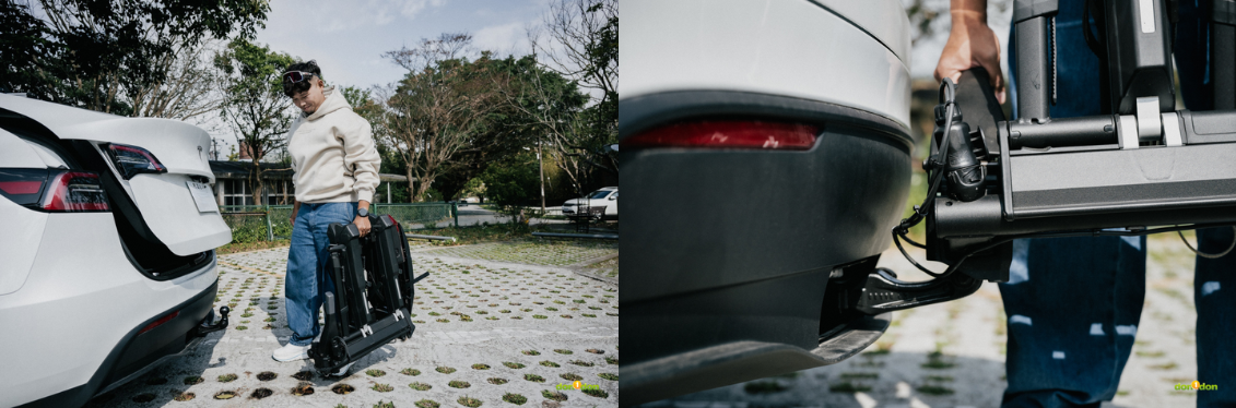 「沒想到用起來真的很方便,只要車後有拖車勾,至監理站變更行照註記(兼供拖曳)就可以安裝。」海珊俐落地操作起安裝過程—放、扣、接、開,四個步驟,慢慢操作不到一分鐘就能完成。「操作非常簡單,若平常不載單車,反向操作把架子拆下來放後車廂就可以了。」