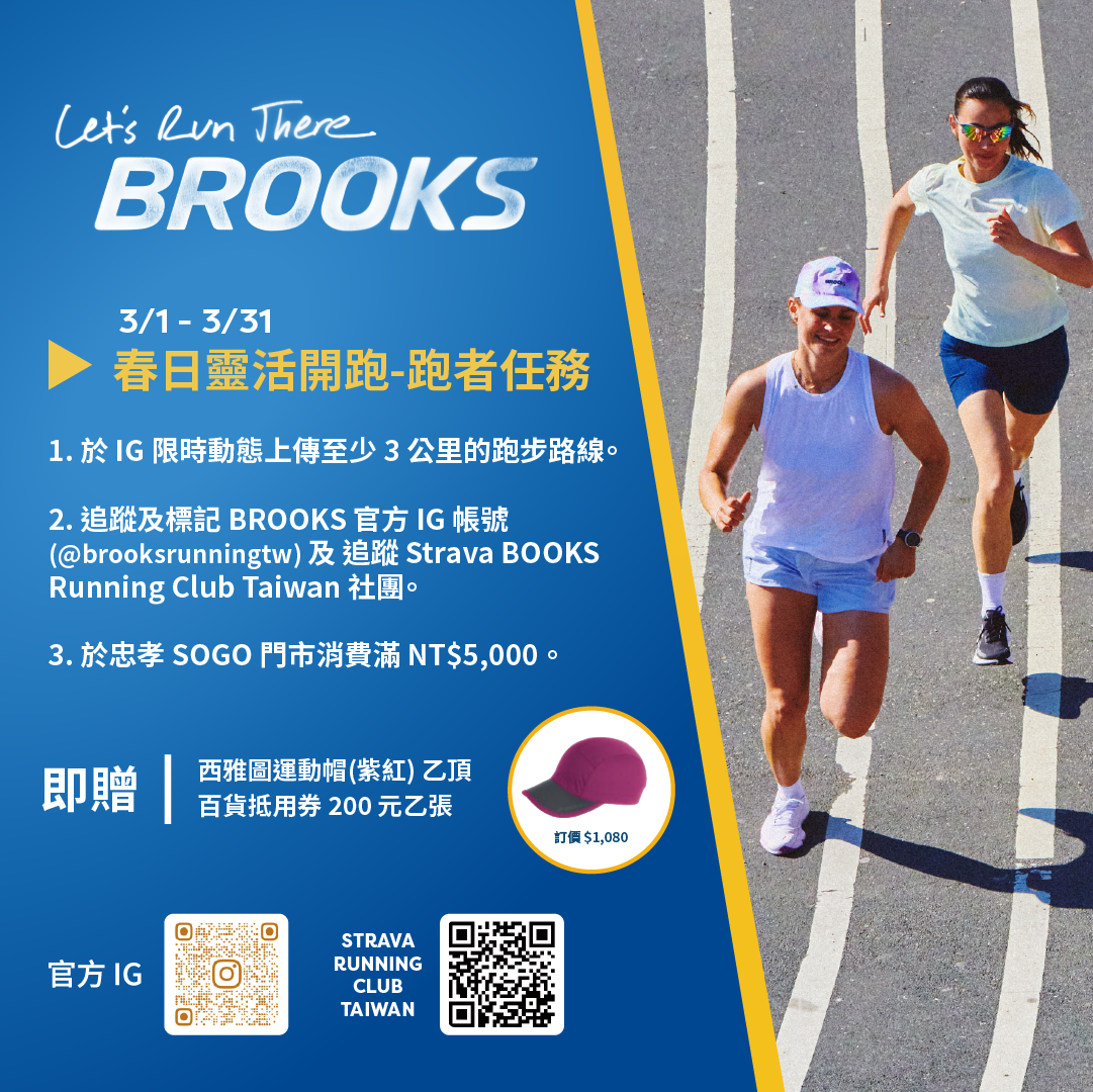 此外,品牌也將「Let’s Run There」延伸至城市街道,透過實體活動邀請跑者用雙腳參與開幕。37日舉辦「Run to Store 5K」揪跑活動,歡迎跑者於 3/7 下午 13:15 於市政府捷運站二號出口集合,一路跑進忠孝 SOGO 新門市,為新據點揭開序幕;同日下午 15:00,「BROOKS ELITE TEAM」菁英選手群也將現身門市,分享訓練心得並與跑者近距離互動交流。整個三月更推出「春日靈活開跑」任務挑戰活動(3/1–3/31),跑者只要完成 3K 跑步紀錄分享、追蹤品牌帳號、並加入 Strava「BROOKS Running Club Taiwan」社團,於店內消費滿 $5,000,即可再獲得西雅圖運動帽與百貨 $200 抵用券加碼好禮。