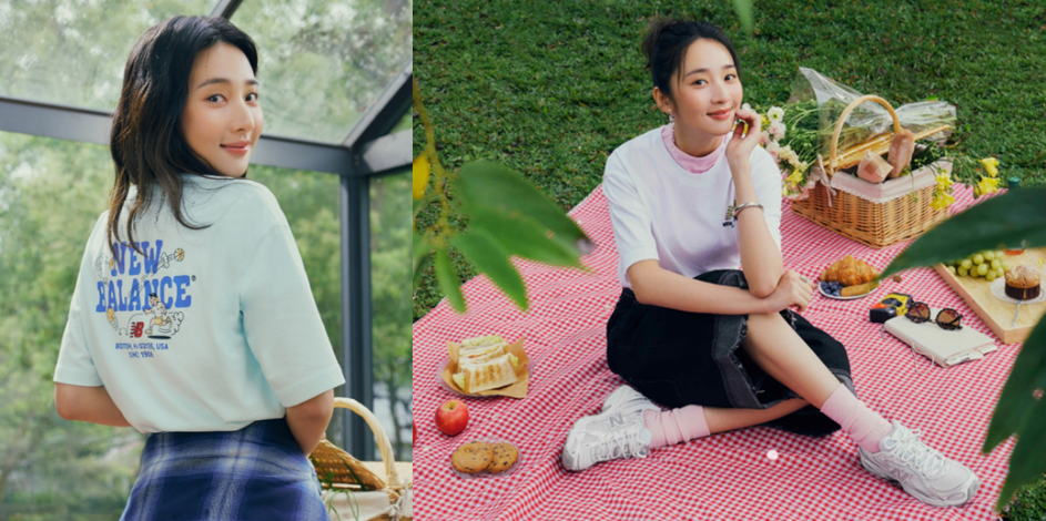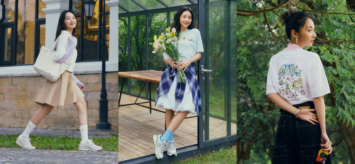 延續春日靈感,李沐以三套清新穿搭演繹自在舒適的青春氛圍。第一套為紫色長袖內搭與白色 Polo 衫,胸口的 SNOOPY 布章增添俏皮感,腳踩 204L 新色「奶油亞麻」,帶來清新的活潑氣息。第二套則以湖藍色 NB BOY T-shirt 配白色花苞裙,腰間的格紋襯衫增添層次感,腳上的 740 新色「奶油松綠」不僅舒適,還為整體造型注入一點街頭感,適合和好友相約咖啡或在公園悠閒踏青。最後一套選擇白色 NB BOY T-shirt 搭配原色牛仔短褲,呈現清新的小男孩風格,無論是戶外運動或輕旅行,都能自在感受春日活力,NB風格旅伴,讓你到哪都型。
