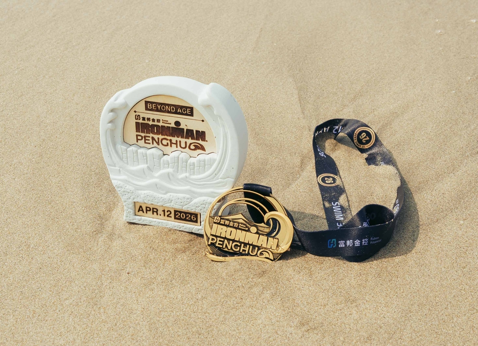 今年 IRONMAN 澎湖的獎盃別具巧思,由牡蠣殼循環材料製作而成。設計靈感汲取自澎湖海浪與跨海大橋的意象,並點綴以珊瑚與咾咕石元素;橋身部分結合實木板與細緻雷雕,展現異材質結合的工藝美學。此外,除了分齡組獎項,今年更首度增設「長青鐵人獎(BEYOND AGE)」,旨在鼓勵樂齡族群挑戰自我,傳遞「運動無國界、熱血無年齡」的精神。