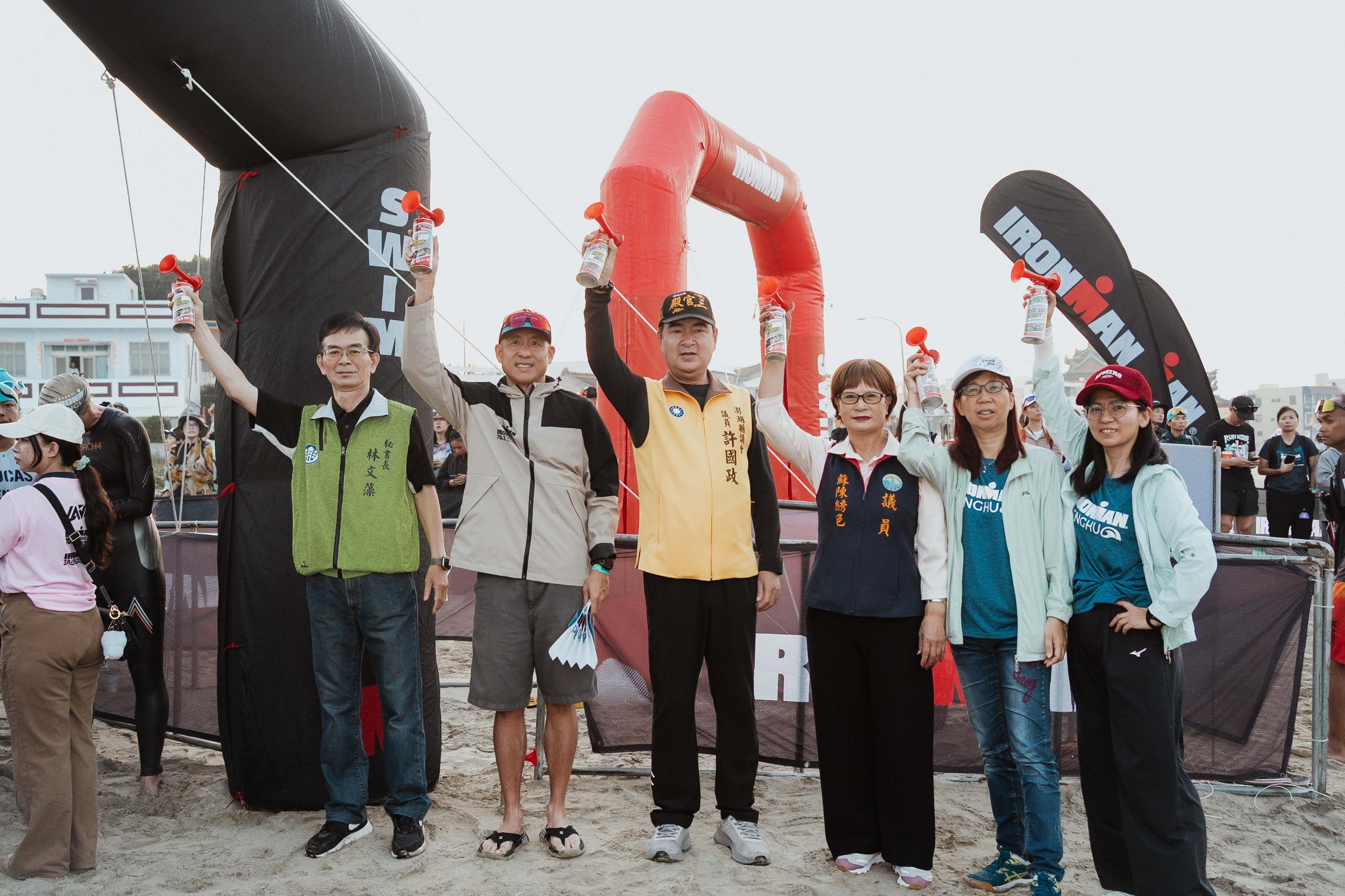 4 月 12 日(日)清晨 6 點,IRONMAN 澎湖由澎湖縣政府林文藻秘書長、許國政議員、蘇陳綉色議員、澎湖縣教育處陳晶卉處長、澎湖縣政府教育處體健科麻雅芳科長、台灣鐵人公司林澤浩董事長共同鳴槍開賽!
