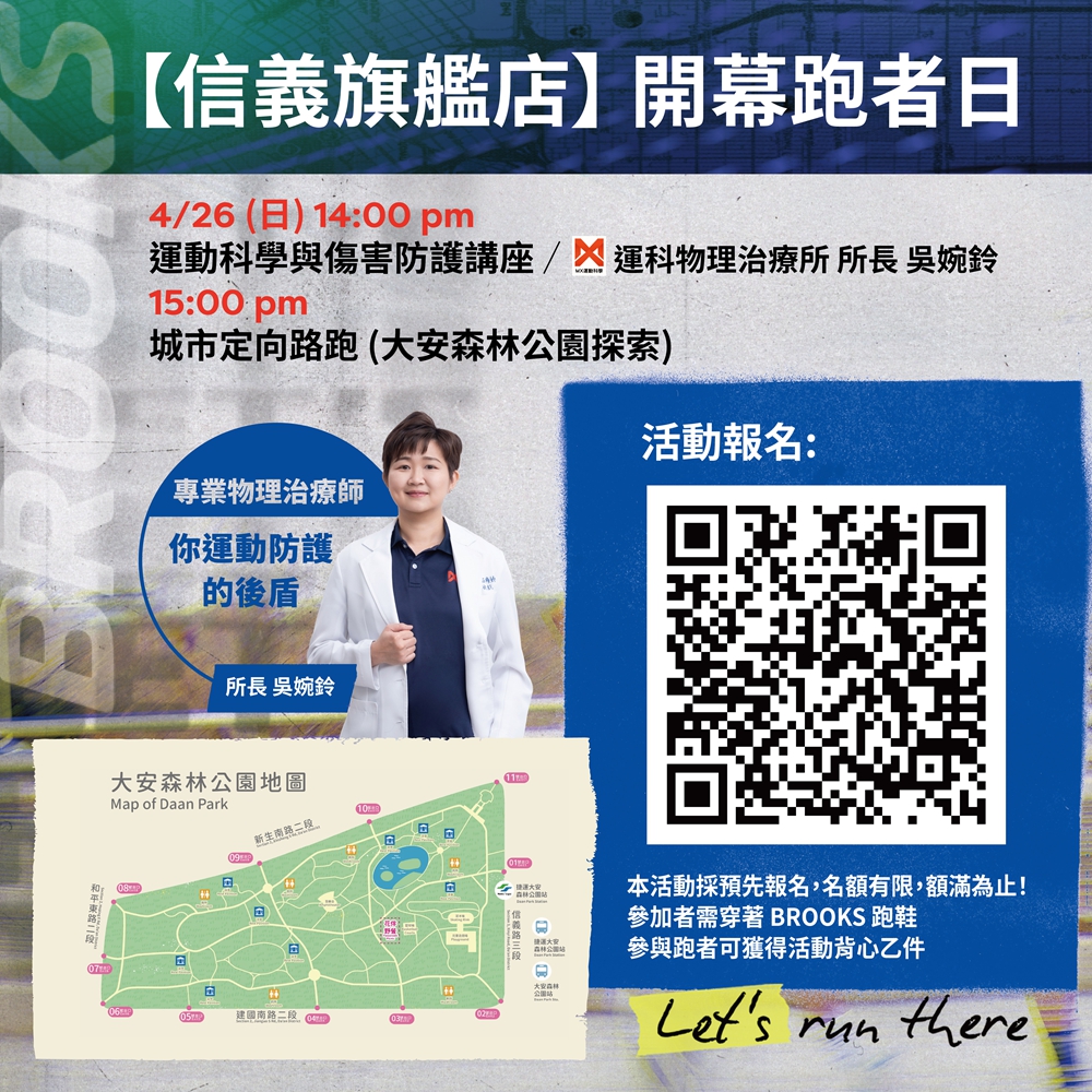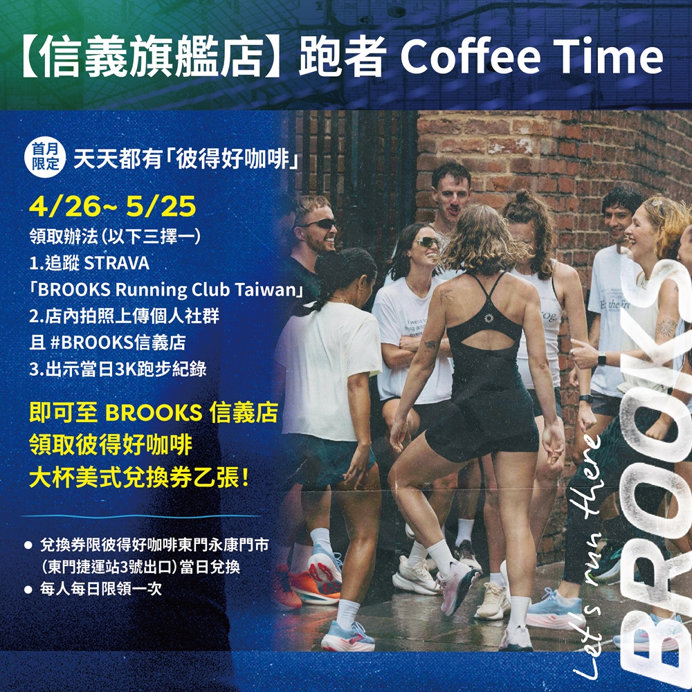 延續 BROOKS 長期深耕跑者社群的精神,信義旗艦店特別於 4 月 26 日推出「跑者日」系列活動。由「運科物理治療所」吳婉鈴所長帶來運動科學與傷害防護講座,協助跑者建立正確訓練觀念;隨後展開城市定向路跑,帶領跑友實際走入大安森林公園,延伸跑步體驗至城市場域。同時,品牌結合跨界生活提案,於 4 月 26 日至 5 月 25 日開幕首月推出「天天都有彼得好咖啡」跑者Coffee Time,輕鬆完成指定任務、每日都可享受「彼得好咖啡」大杯美式咖啡,將跑步與咖啡文化交織,讓運動延伸為可被享受的生活節奏。透過專業內容與生活風格的整合,BROOKS 信義旗艦店不僅是購物空間,更成為跑者交流、累積動能、與延伸日常靈感的重要據點,進一步強化品牌與城市跑步文化之間的連結。
