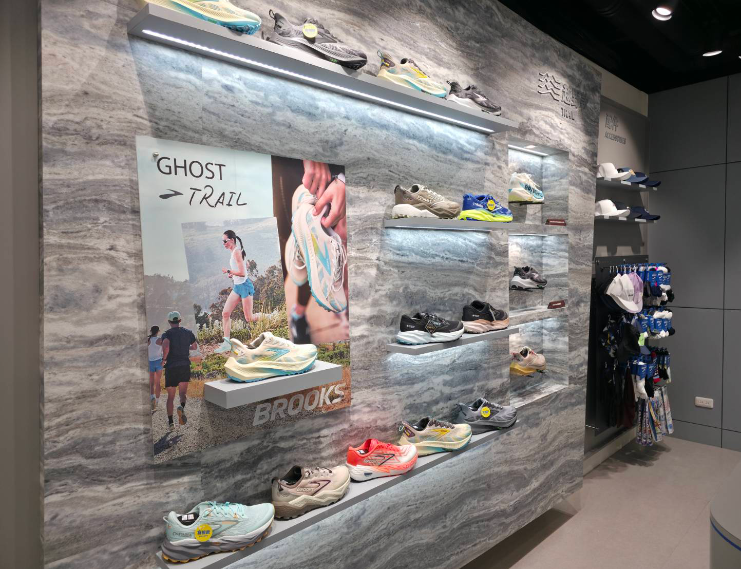 在空間設計上,BROOKS 信義旗艦店以「金屬潮流」為核心語彙,透過俐落線條與金屬結構材質,打造兼具未來感與專業感的跑步場域,形塑鮮明品牌識別與沉浸式購物體驗。門市依據不同跑步情境,精準規劃「避震緩衝區」、「推進加速區」、「長距離訓練區」與「越野跑區」,對應舒適保護、速度訓練、耐力累積、與地形挑戰等多元需求,其中亦陳列最新上市的 GHOST 18 與 GLYCERIN FLEX 等熱門鞋款。同時整合服飾配件區,提供從裝備選擇到整體搭配的一站式完整體驗,透過產品與空間的邏輯化編排,將專業跑步知識轉化為直覺可感的消費體驗,提升整體選購效率與體驗深度。