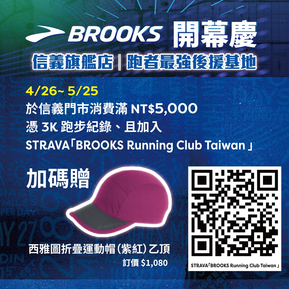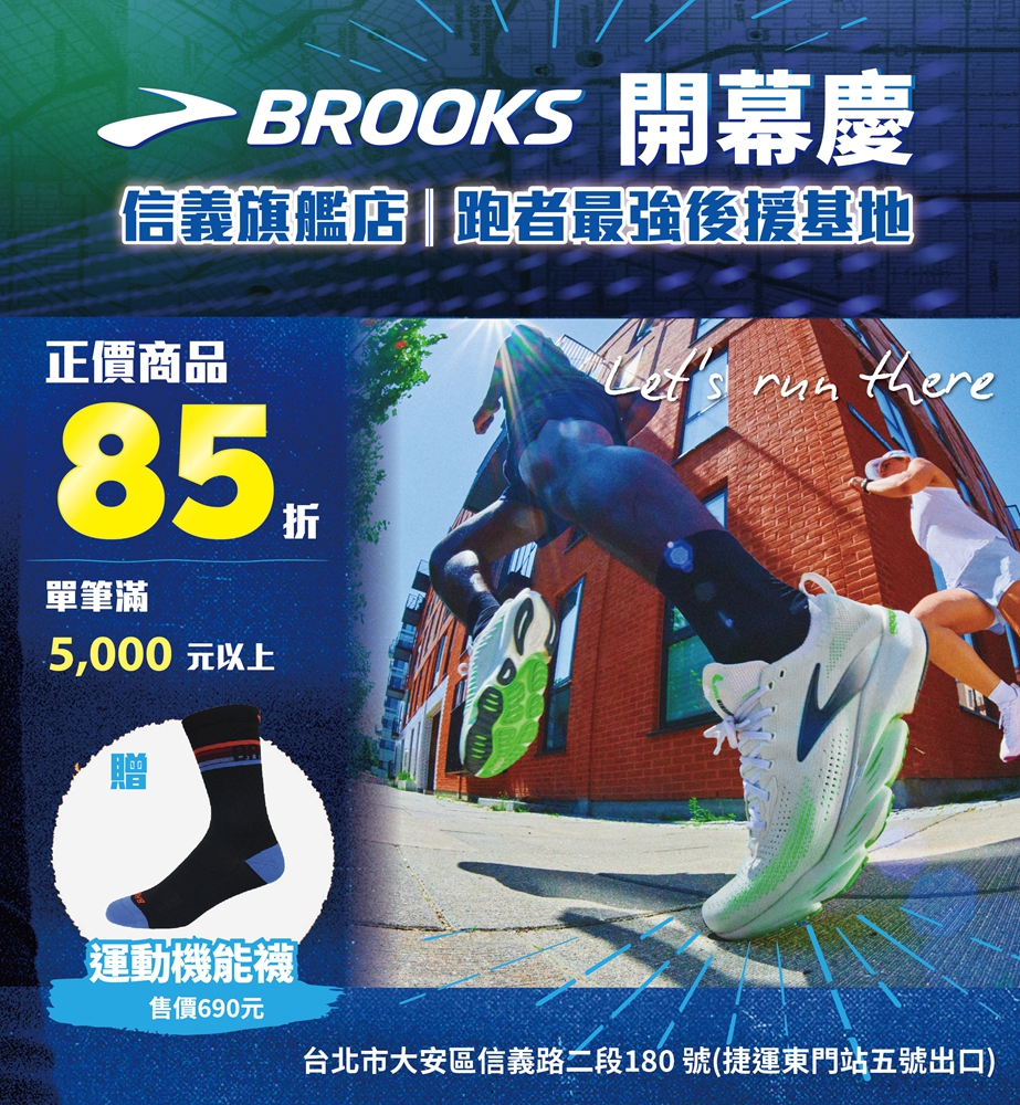 歡慶 BROOKS 信義旗艦店開幕,品牌更加碼於 4 月 12 日至 5 月 10 日期間推出開幕限定禮遇,全館正價商品享 85 折優惠,單筆消費滿 NT$5,000 再贈品牌機能運動襪乙雙。此外,4 月 26 日至 5 月 25 日同步推出開幕慶任務挑戰活動,跑者只要出示 3K 跑步紀錄、且加入 Strava「BROOKS Running Club Taiwan」跑步社群,於店內單筆消費滿 NT$5,000,即可再獲贈西雅圖運動帽乙頂;同時提供 Soonli 能量補給商品專屬 9 折優惠,從裝備、訓練到補給全面串聯,打造更完整的跑步生活體驗。