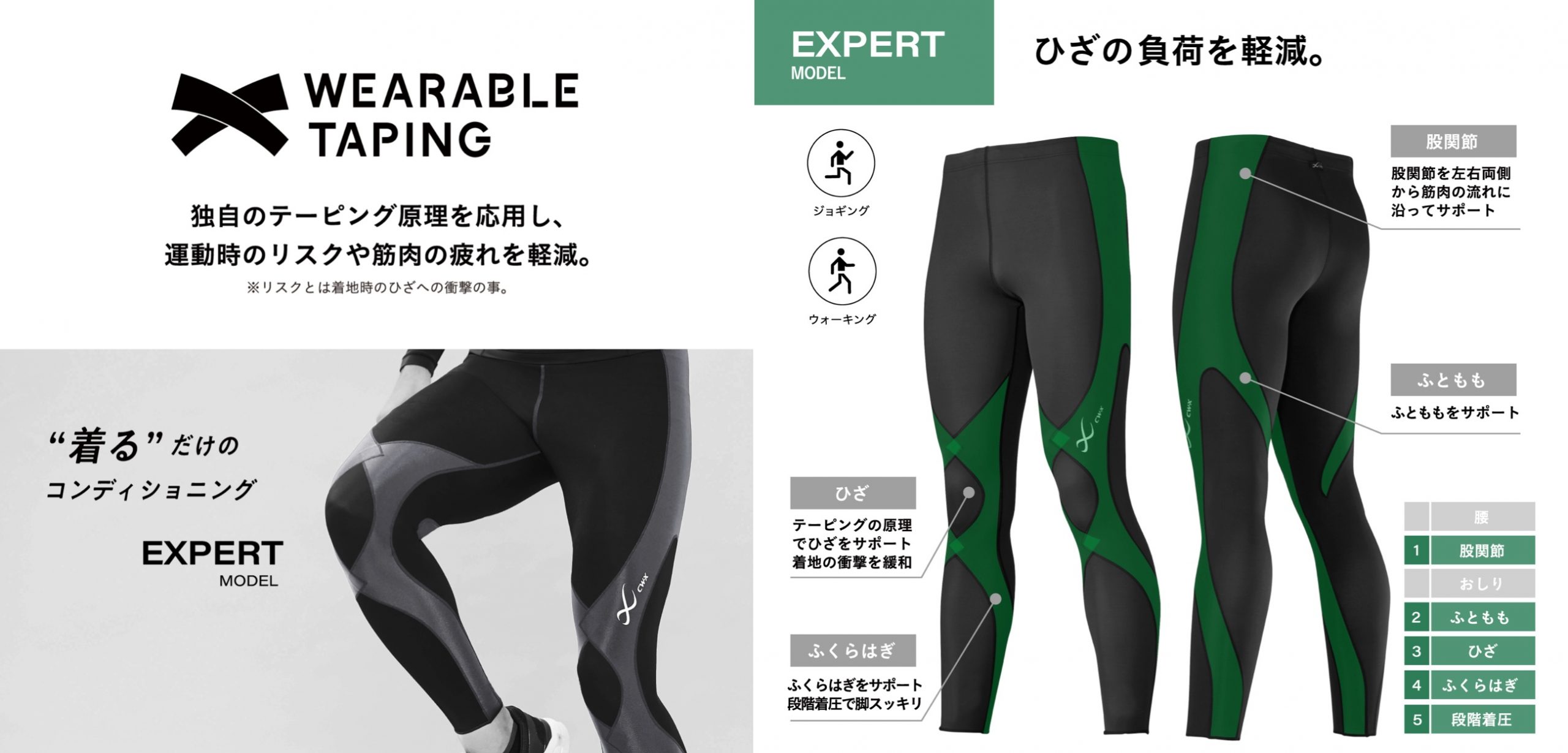 如果你過去只把壓縮褲理解為「穿起來很緊的運動褲」,可以先從 CW-X 的 Wearable Taping 概念開始理解。它的重點不是單純加壓,而是把貼紮支撐邏輯轉化為服裝結構。