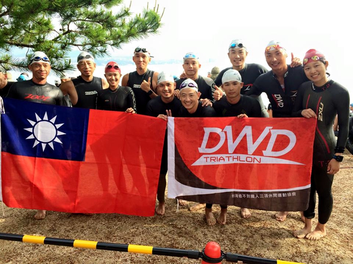 出發前神社住持舉行了肅穆的祈福儀式,整場數百名選手與家屬都靜靜地低頭祈禱,期待賽事能順利進行,大家健康完賽,氣氛真是相當莊嚴。而我們也同樣準備了最愛的國旗與隊旗合照,出發前有點假掰地舉手歡呼,終於可以下水囉!