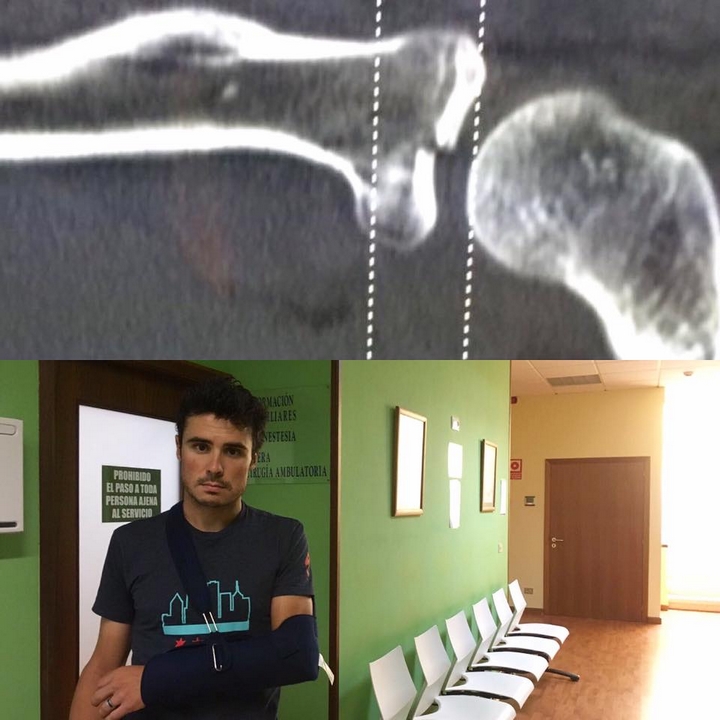 我真的很抱歉,可能大家也都知道我在昨天完成自行車訓練的時候,發生了一些愚蠢的意外,在時速低於每小時15km下。我立刻在手肘上感到疼痛,所以我就去醫院做了檢查,掃描顯示我的左臂橈骨有移位性的骨折,所以就在今天要到醫院做手術修復。