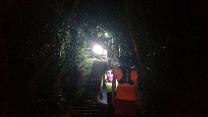 步道上只有少許的路燈,必須靠著頭燈照亮前面的路,以策安全。