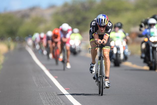 進入單車段後,女子選手在前半段大多採保守策略,直到Hawi折返點,Ryf率先發難衝出並拉出與其他人的差距,第二集團此時僅有Anja Beranek能追上,約莫120km後,剩Ryf獨走並首先進T2,單車時間4時52分,為女子選手中最快者,進T2後已經領先Anja Beranek達8分鐘。