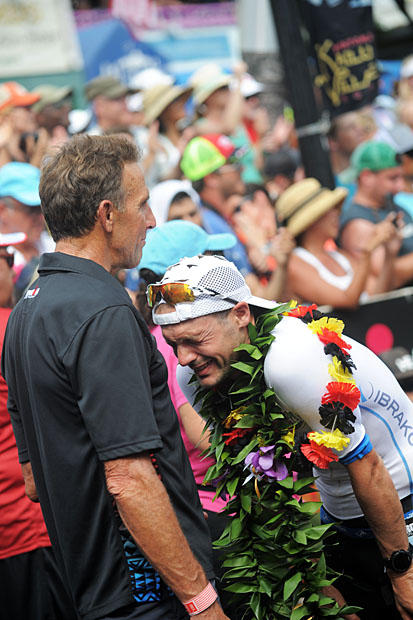 今年在終點拉起終點線等候Jan Frodeno來到的人,正好就是Mark Allen(下圖右)與Dave Scott(下圖左),時代傳承的意義相當濃厚!