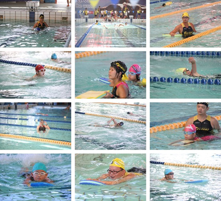 國體大的泳池是標準50公尺長水道,這次商借了4個水道,共需去回各二趟,由高年級至低年級分梯下水,每完成50公尺觸牆後更換一次水道,避免小鐵人被追逐及對撞的危險,每水道皆有志工在水中細心戒護,讓小朋友可在水中自在的競速或悠游打水完成200公尺。