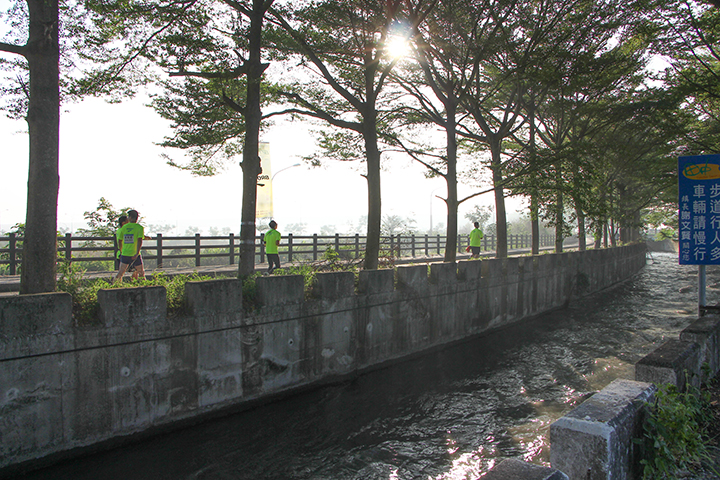 八堡圳佔賽道路線的比例也相當高。這條灌溉彰化地區近兩萬公頃面積的水圳,已經有300年的歷史,溪水潺潺流動,種植在水圳兩旁的柳樹隨風搖逸,步道旁台灣巒樹與黃槐讓八堡圳染上秋冬的色調,也讓跑者沿途欣賞到了不一樣的水圳風情。