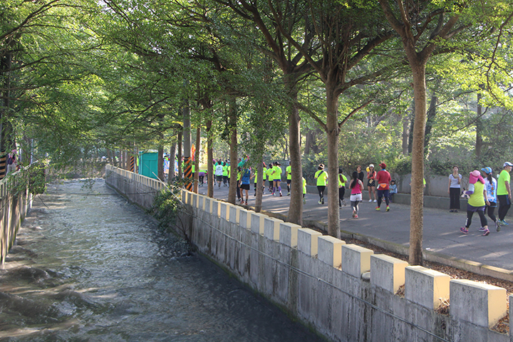 八堡圳佔賽道路線的比例也相當高。這條灌溉彰化地區近兩萬公頃面積的水圳,已經有300年的歷史,溪水潺潺流動,種植在水圳兩旁的柳樹隨風搖逸,步道旁台灣巒樹與黃槐讓八堡圳染上秋冬的色調,也讓跑者沿途欣賞到了不一樣的水圳風情。