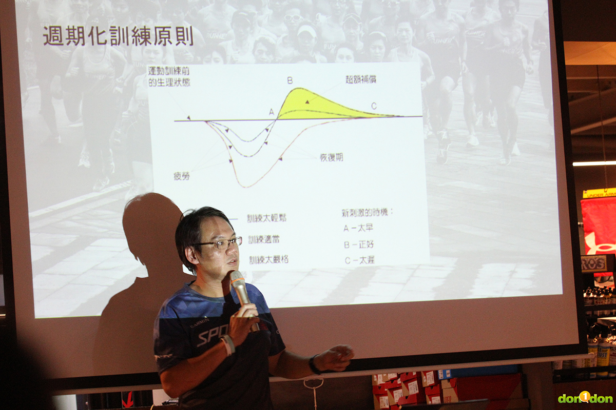 Jason分享到週期化的訓練內容包括了,基礎期、進展期、巔峰期及賽前減量,每個時期的訓練目標不同,基礎期主要目的為有氧訓練紮根「有氧訓練的好處是增強左心室的力量,讓身體使用能量有效率,並達到增加肌肉微血管量的效用。」在基礎期結束時會安排一個有氧能力測驗「跑上一段時間,目標是心率的飄移率在一定的區間。」這樣就算完成基礎期的訓練;接下來進展期的目標為推升每個人的最大攝氧量(VO2max),以間歇訓練課表的方式增加心肺能力;巅峰期的目標則是增進乳酸值的能力,讓身體可以用更高的強度維持上更長的時間,最後則是比賽期及減量。在每個訓練週期中課程安排都有最大期與減量期「我們總擔心練不夠,但變强總在减量時。」Jason說,課程中強調休息和恢复的重要,所以要強迫學員在這段時間不可以參加比賽。所有課程的基礎都與每個人的基礎能力相關,因此PB班的第一堂課就是測最大心率與静止心率,做為心率區間設定的基準,這樣Garmin手錶記錄的數據才有參考價值。