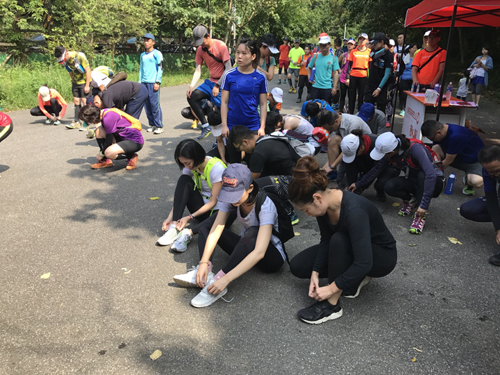教練教導必須要將鞋帶綁好塞好,避免多出來鞋帶勾到山徑中的植物造成傷害。