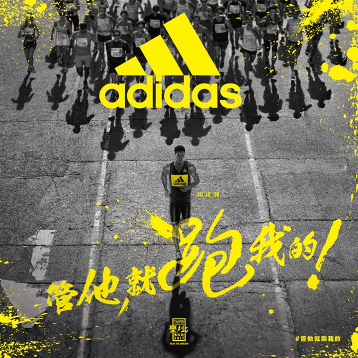 為了體現「#管他就跑我的」路跑精神,adidas與臺北馬拉松大會共同邀請楊俊瀚為馬拉松跑者加油,並以其自身經驗鼓舞跑者們勇於踩出自己的節奏,開創更好的自己。田徑好手楊俊瀚今年征戰亞洲田徑錦標賽奪得200公尺金牌,8月更打破全國紀錄,為臺灣拿下世大運首面男子短跑獎牌,以實際表現打破眾人的質疑,開創臺灣田徑新紀錄;除了在田徑場上持續挑戰自我極限,楊俊瀚在求學過程也同樣打破一般人對運動員學科較差的刻板印象,高中時期更以全校第二名的優異成績畢業。不管是場內或是場外的楊俊瀚,皆完美展現「#管他就跑我的」精神。